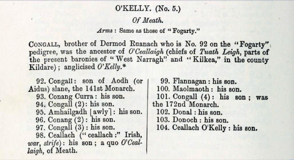 According to Dr John O'Hart he is the Ancestor of the O'Kelley of Meath.